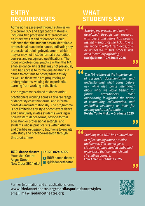 The MA Diasporic Dance Styles is a unique distance education/low residency provision within IRIE! Dance Theatre’s Education Department. This Post Graduate provision offers dance artists the opportunity to expand their practice through independently focused research within a supportive learning environment.